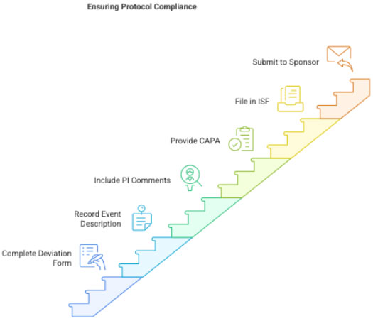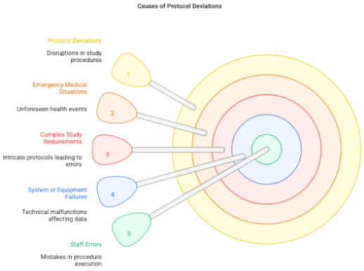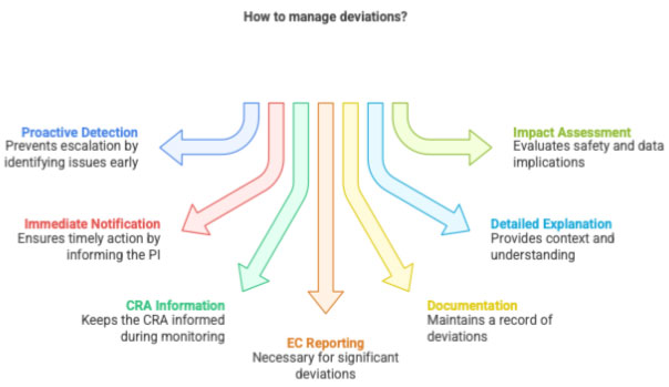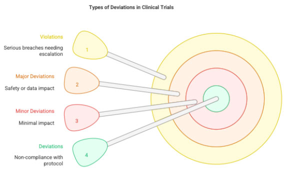 • Major deviation: Impacts safety, rights, welfare, or data reliability (e.g., enrolling an ineligible patient).