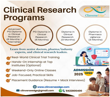 • Advanced Post Graduate Diploma in Clinical Research (12 months + internship)