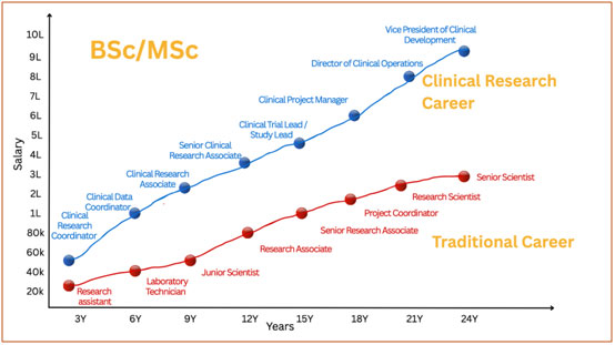 • Significantly Higher Salaries: As shown, clinical research professionals earn more than conventional roles at every stage.